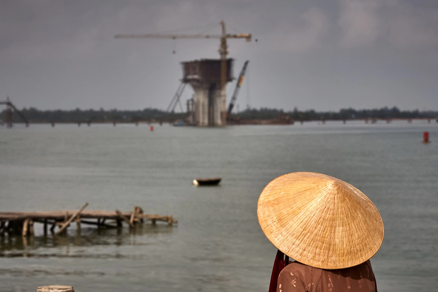 In the final image, an old woman stands apart, staring at the structure of a bridge, still incomplete. Its presence interrupts the horizon. Change is imminent.